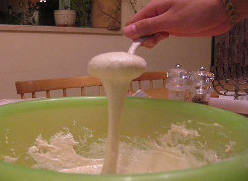 המרקם צריך לצאת משהו בין בצק לחם לפנקייק – קרמי וקל לערבוב, אבל לא נוזלי מדי. אם תרימו כף, הבלילה תנזל ממנה באיטיות, בערך ככה. אם המרקם לא לרוחכם, שחקו עם זה – עד שתצליחו. אם בצקי מדי תוסיפו עוד קצת לבן או ביצה, ואם זה נוזלי מדי תוסיפו קמח. זה באמת קל ואין סיבה שלא תגיעו למרקם מגניב.