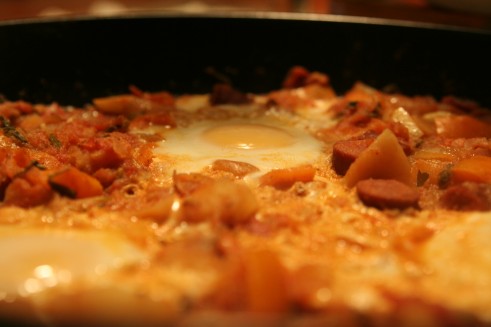 טוב, בעיקרון מטגנים כמה ירקות עם רסק עגבניות ומוסיפים ביצים בסוף. אבל בואו נרשום את זה יפה בשביל הבנות שאולי במקרה מסתובבות פה.
